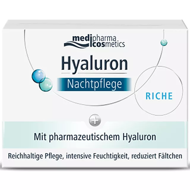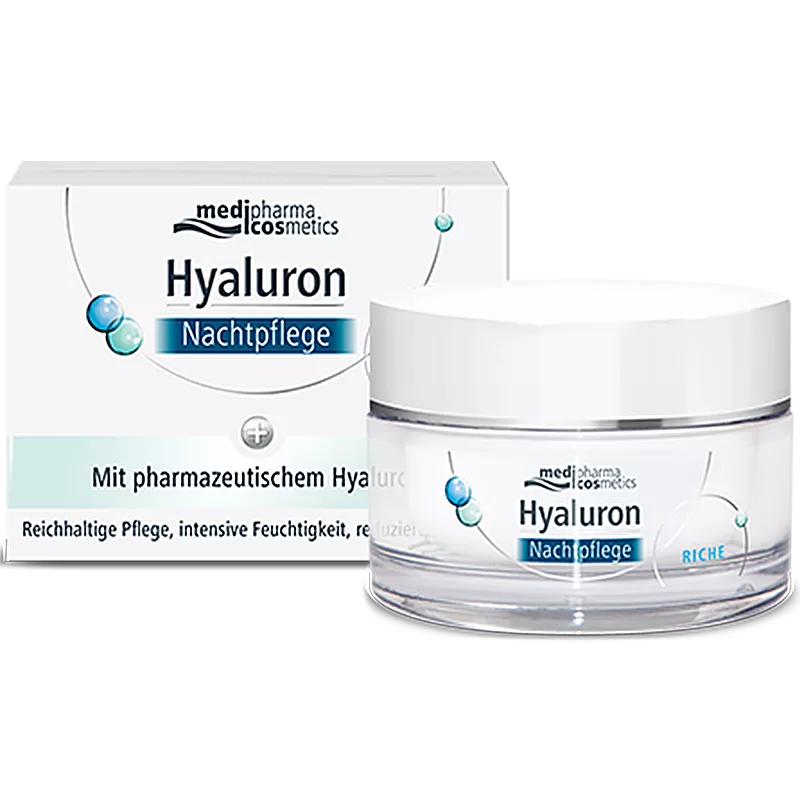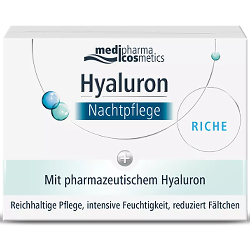 Нічний крем Hyaluron riche призначений для зволоження та живлення сухої, дуже сухої, та шкіри, схильної до лущення. Крем містить фармацевтичну гіалуронову кислоту, вітамін Е, пантенол та високу концентрацію ліпідів.