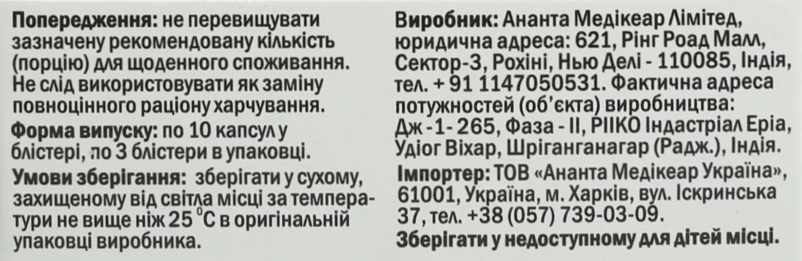Спосіб застосування. Дорослим приймати по 1 капсулі 2 рази на день після їди або індивідуально за призначенням лікаря. Термін вживання. Від 3 до 6 місяців. Надалі тривалість прийому та можливість повторних курсів погоджувати з лікарем. Застереження. Не перевищувати вказану дозу для щоденного вживання.Не слід використовувати як заміну повноцінного раціону харчування.