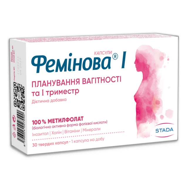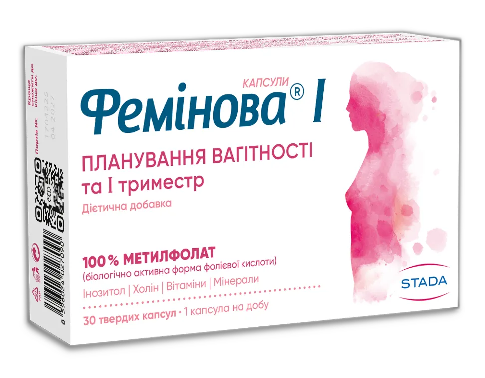 Фолати сприяють збільшенню тканин матері під час вагітності, нормальному кровотворенню та відіграють роль у поділі клітин. Фемінова І — це дієтична добавка для планування вагітності, що містить 100% метилфолату, активної форми фолатів, яка легко засвоюється кожною жінкою. Доповнена поживними речовинами, ретельно підібраними для підтримки в період підготовки до вагітності.