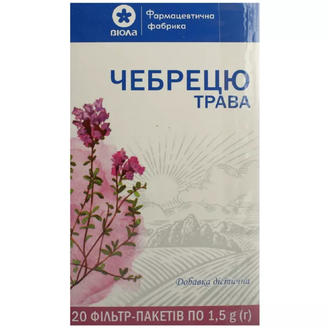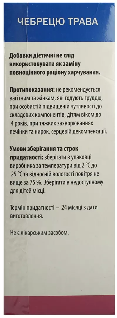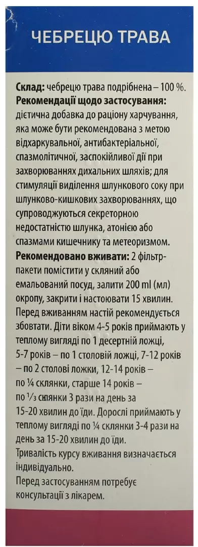 Склад: чебрецю трава подрібнена – 100 %. Рекомендації щодо застосування: дієтична добавка до раціону харчування, яка може бути рекомендована з метою відхаркувальної, антибактеріальної, спазмолітичної, заспокійливої дії при захворюваннях дихальних шляхів; для стимуляції виділення шлункового соку при шлунково-кишкових захворюваннях, що супроводжуються секреторною недостатністю шлунка, атонією або спазмами кишечнику та метеоризмом.Добавки дієтичні не слід використовувати як заміну повноцінного раціону харчування. Не є лікарським засобом.