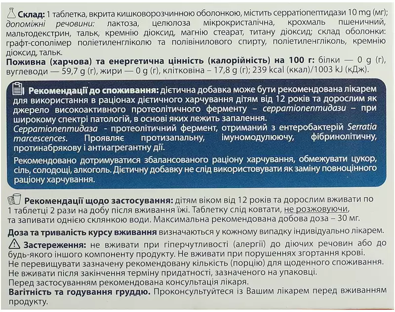 Рекомендації щодо застосування. Дієтична добавка може бути рекомендована лікарем для використання в раціонах дієтичного харчування дітям від 12 років та дорослим як джерело високоактивного протеолітичного ферменту – серратіопептидази – при широкому спектрі патологій, в основі яких лежить запалення. Рекомендується дотримуватися збалансованого раціону харчування, обмежувати цукор, сіль, солодощі, алкоголь.Дієтичну добавку не слід використовувати як заміну повноцінного раціону харчування.