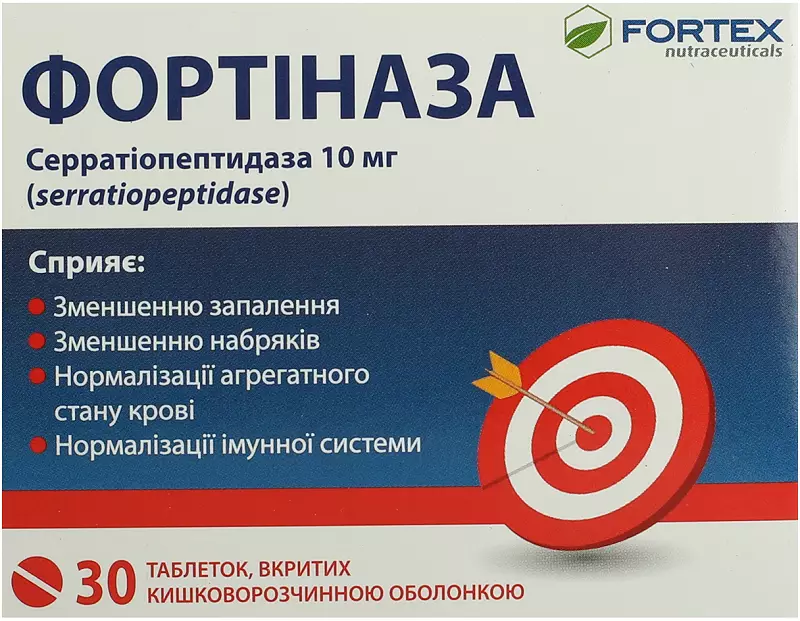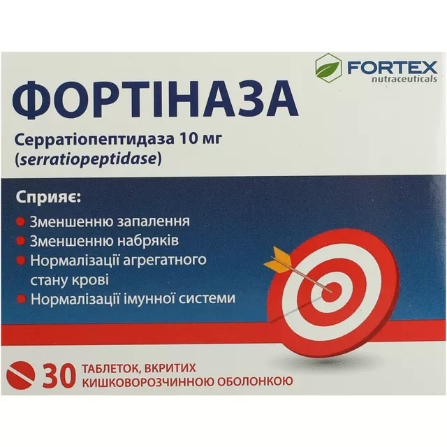 Склад. 1 таблетка, покрита кишково-розчинною оболонкою, містить серратіопептидазу 10 мг (мг). Опис. Серратіопептидаза – протеолітичний фермент, одержаний з ентеробактерій Serratia marcescences. Виявляє протизапальну, імуномодулюючу, фібринолітичну, протинабрякову та антиагрегантну дії. Використання серратіопептидази має багаторічну успішну історію в Японії та країнах Європи.ФОРТИНАЗА випускається у спеціальних таблетках, покритих кишковорозчинною оболонкою, яка не допускає контакту серратіопептидази з агресивним середовищем шлунка та доставляє фермент безпосередньо у тонкий кишечник.