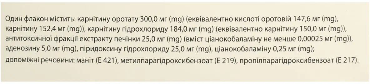 діючі речовини: один флакон містить карнітину оротату 300,0 мг (еквівалентно кислоті оротовій 147,6В мг, карнітину 152,4 мг), карнітину гідрохлориду 184,0 мг (еквівалентно карнітину 150,0В мг), антитоксичної фракції екстракту печінки 25,0 мг (вміст ціанокобаламіну не менше 0,00025В мг), аденозину 5,0 мг, піридоксину гідрохлориду 25,0 мг, ціанокобаламіну 0,25 мг;