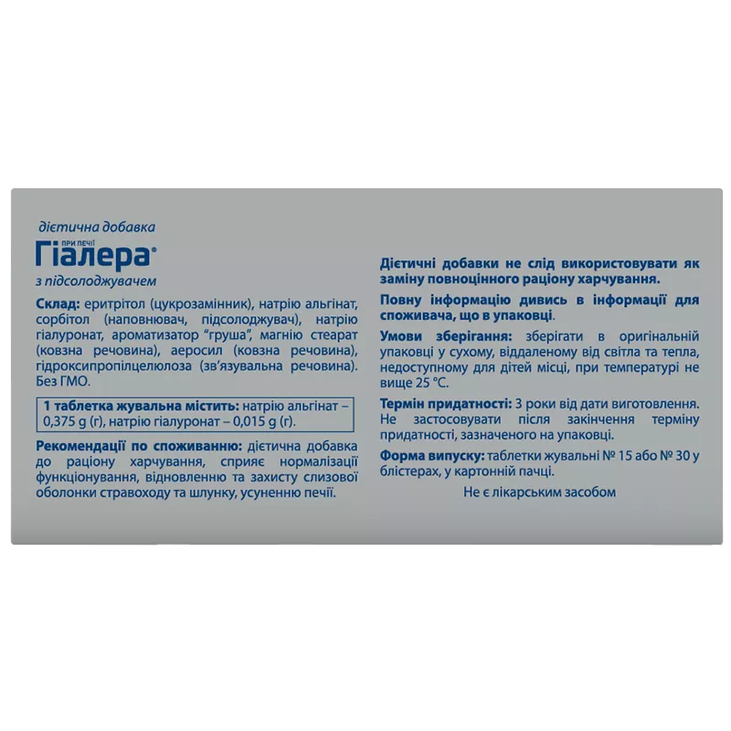 Склад: еритрітол (цукрозамінник), натрію альгінат, сорбітол (наповнювач, підсолоджувач), натрію гіалуронат, ароматизатор “груша”, магнію стеарат (ковзна речовина), аеросил (ковзна речовина), гідроксипропілцелюлоза (зв’язувальна речовина). Без ГМО.Рекомендації по споживанню: дієтична добавка до раціону харчування, сприяє нормалізації функціонування, відновленню та захисту слизової оболонки стравоходу та шлунку, усуненню печії.