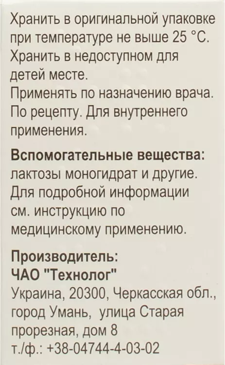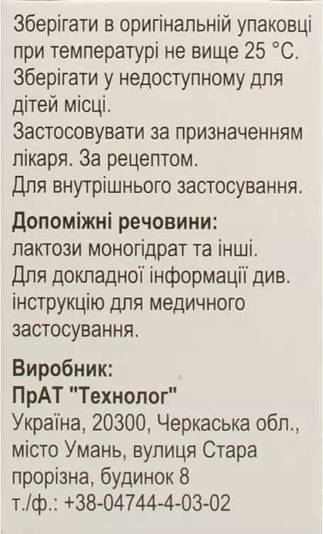 Категорія відпуску. За рецептом. Виробник. ПрАТ «Технолог».Місцезнаходження виробника та його адреса місця провадження діяльності. 20300, Україна, 20300, Черкаська обл., місто Умань, вулиця Стара прорізна, будинок 8.