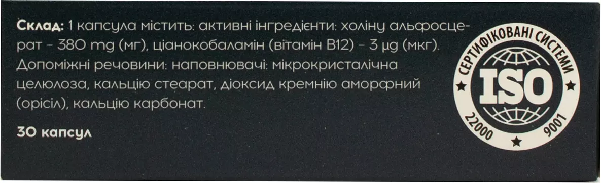 Склад: 1 капсула містить: активні інгредієнти: холіну альфосцерат – 380 mg (мг), ціанокобаламін (вітамін В12) – 3 µg (мкг); допоміжні речовини*: наповнювачі: мікрокристалічна целюлоза, кальцію стеарат, діоксид кремнію аморфний (орісіл), кальцію карбонат. Без ГМО. Рекомендації щодо застосування: рекомендований з метою покращення функціонального стану центральної нервової системи: позитивно впливає на пізнавальні та поведінкові реакції, покращує концентрацію уваги, запам'ятовування та відтворення інформації; покращує настрій та мозковий кровообіг, активізує інтелектуальну діяльність; має нейропротекторні властивості. Спосіб застосування: вживати дорослим по 1 капсулі 2 або 3 рази на добу, переважно під час їжі.Рекомендований курс приймання: 1-2 місяці. Надалі термін вживання визначає лікар.