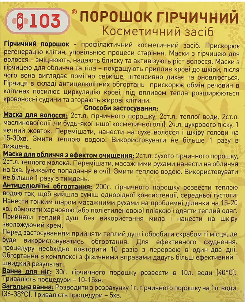 Ванна для ніг: 30 грам гірчичного порошку розвести в 10 л теплої води (40 °С). Тривалість процедури – 10-15хв.