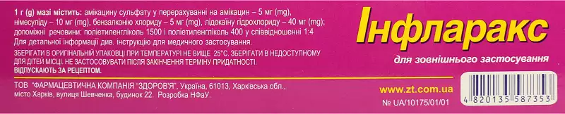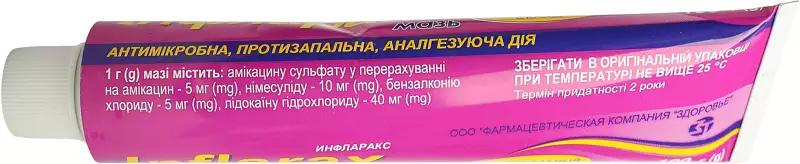 «Инфларакс мазь туба 100 г, Здоровье» – это комбинированное лекарственное средство для наружного применения, которое обладает мощным противовоспалительным, антибактериальным и обезболивающим действием. В состав препарата входят четыре активных вещества: амикацин, нимесулид, бензалкония хлорид и лидокаин. Благодаря сочетанию антибиотика, местного анестетика, антисептика и нестероидного противовоспалительного средства, мазь обеспечивает эффективную санацию инфицированных ран, устраняет боль и уменьшает воспаление. В многочисленных источниках на «Инфларакс» мазь отзывы пациентов подтверждают именно комплексное действие средства при различных типах раневых поражений. Препарат выпускается в форме мази желтовато-зелёного цвета и отпускается по рецепту врача.