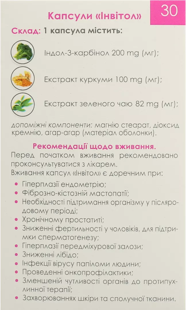 Склад1 капсула містить: Індол-3-карбінол 200 mg (мг); Екстракт куркуми 100 mg (мг), стандартизований за вмістом куркуміноїдів не менше 20%; Екстракт зеленого чаю 82 mg (мг), що еквівалентно епігалокатехін-3-галату – 45 mg (мг);