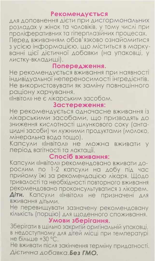 ВластивостіКапсули «Інвітол» вживаються як джерело біологічно активних речовин з метою корекції станів, які супроводжуються або викликані дисгормональними розладами у жінок і чоловіків, у тому числі при проліферативних і гіперплазійніх процесах.