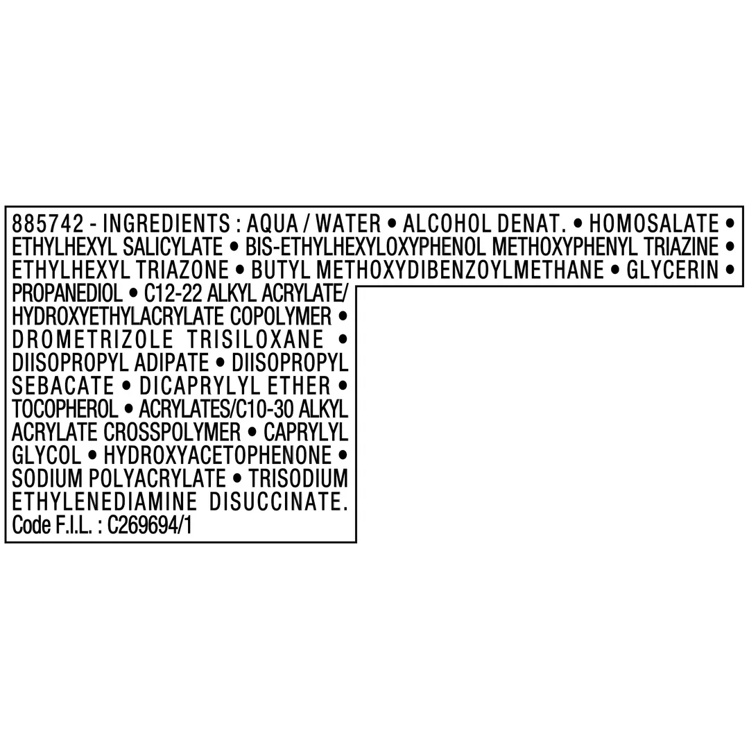 Добре струсити пляшку перед застосуванням. Розпилюйте на шкіру рівномірно з невеликої відстані. Не розпилюйте прямо на обличчя. Уникайте контакту з тканиною. Склад: 885829 3 – INGREDIENTS: AQUA / WATER , ALCOHOL DENAT. , ETHYLHEXYL SALICYLATE , ETHYLHEXYL TRIAZONE , BUTYL METHOXYDIBENZOYLMETHANE , BIS-ETHYLHEXYLOXYPHENOL METHOXYPHENYL TRIAZINE , ISOPROPYL PALMITATE , DIISOPROPYL ADIPATE , GLYCERIN , PROPANEDIOL , PHENYLBENZIMIDAZOLE SULFONIC ACID , DICAPRYLYL ETHER , TRIETHANOLAMINE , C12-22 ALKYL ACRYLATE/HYDROXYETHYLACRYLATE COPOLYMER , ACRYLATES/C10-30 ALKYL ACRYLATE CROSSPOLYMER , CAPRYLYL GLYCOL , DROMETRIZOLE TRISILOXANE , HYDROXYACETOPHENONE , SODIUM POLYACRYLATE , TOCOPHEROL , TRISODIUM ETHYLENEDIAMINE DISUCCINATE , VITREOSCILLA FERMENT (F.I.L. Z289009/1).
