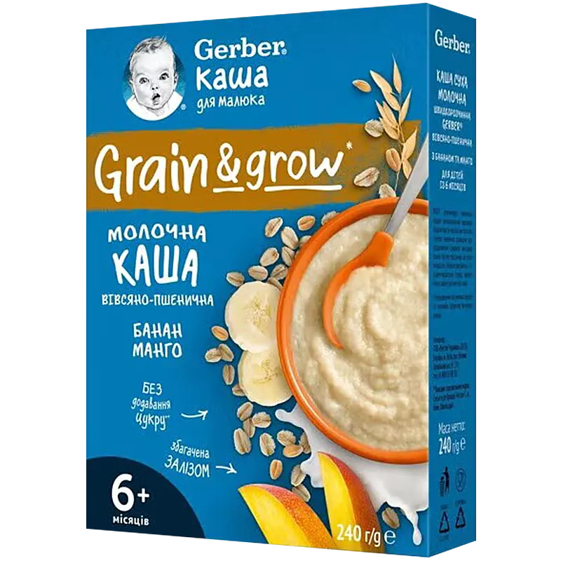 Каша молочная Гербер (Gerber) овсяно-пшеничная, банан и манго с 6 месяцев, 240 г, Nestlе Portugal S. A.