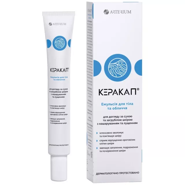 КЕРАКАП® емульсія – щоденний догляд тонкої шкіри (складки шкіри, лінія росту волосся, брови, за вухами), що супроводжується сухістю та загрубінням з нашаруванням та лущенням незалежно від причин (у тому числі для людей з псоріазом, гіперкератичними формами екземи, себореєю та інше)