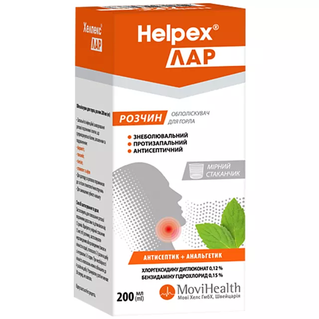 Хелпекс® ЛАР — антисептичний, знеболювальний, протизапальний засіб для лікування запальних та інфекційних захворювань ротової порожнини і горла, що супроводжуються болем, запаленням та подразненням: фарингіту, тонзиліту, гінгівіту, стоматиту та афт. Чинить антисептичну дію у ротовій порожнині, полегшує ковтання. Застосовується з профілактичною метою до та після проведення стоматологічних процедур. Зменшує утворення зубного нальоту та прояви гінгівіту, застосовується як альтернатива оральним гігієнічним процедурам.