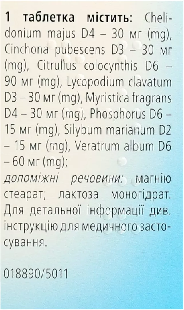 Склад лікарського засобу:діючі речовини: 1 таблетка містить: Chelidonium majus D4 – 30 мг, Cinchona pubescens D3 – 30 мг, Citrullus colocynthis D6 – 90 мг, Lycopodium clavatum D3 – 30 мг, Myristica fragrans D4 – 30 мг, Phosphorus D6 – 15 мг, Silybum marianum D2 – 15 мг, Veratrum album D6 – 60 мг;