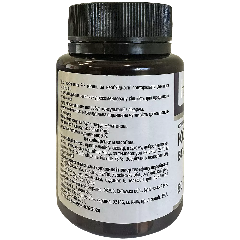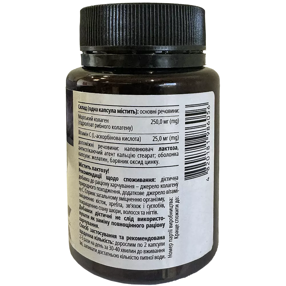 Склад, 1 капсула містить: основні речовини: морський колаген (гідролізат рибного колагену) — 250,0 мг (mg), вітамін С (L-аскорбінова кислота) — 25,0 мг (mg); допоміжні речовини: наповнювач лактоза, антиспікаючий агент кальцію стеарат; оболонка капсули: желатин, барвник оксид цинку. Містить лактозу! Рекомендації щодо споживання: дієтична добавка до раціону харчування - джерело колагену природного походження, додаткове джерело вітаміну С. Сприяє загальному зміцненню організму, зміцненню кісток, хребта, зв’язок і суглобів, для покращенню стану шкіри, волосся та нігтів.Дієтичні добавки не слід використовувати як заміну повноцінного раціону харчування.