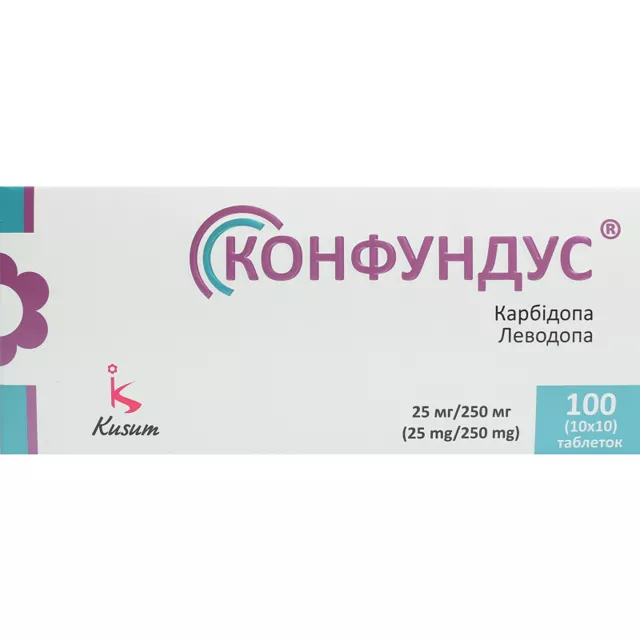 Конфундус® – комбінований протипаркінсонічний засіб, який містить метаболічний попередник дофаміну – леводопу, що застосовується як замісна терапія при хворобі/синдромі Паркінсона, та інгібітор периферичної допа-декарбоксилази – карбідопу, що перешкоджає метаболізму леводопи до дофаміну у периферичному кровообігу, збільшуючи таким чином кількість леводопи, що потрапляє в мозок і перетворюється там на дофамін. Така комбінація дає можливість застосовувати меншу дозу леводопи, що знижує частоту та тяжкість побічних ефектів.
