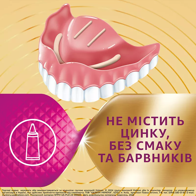 Пом’якшувальний ефект на слизову оболонку для захисту ясен від тиску , спровокованого частковими та повнознімними зубними протезами. Надає стійку фіксацію протягом 12-ти годин.