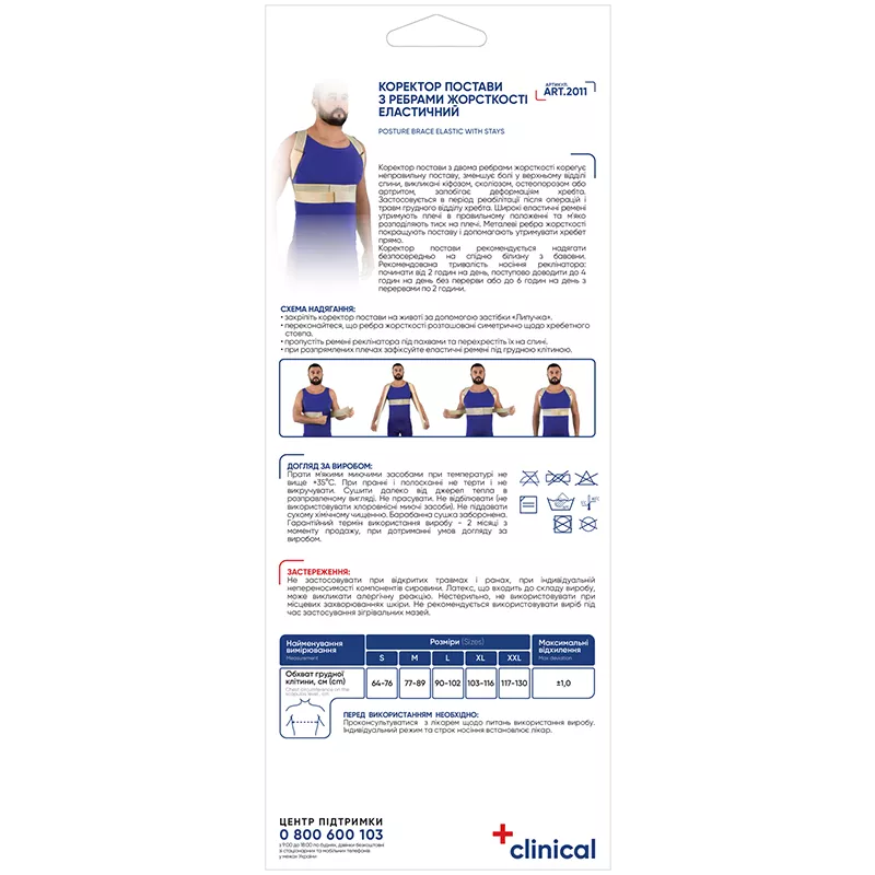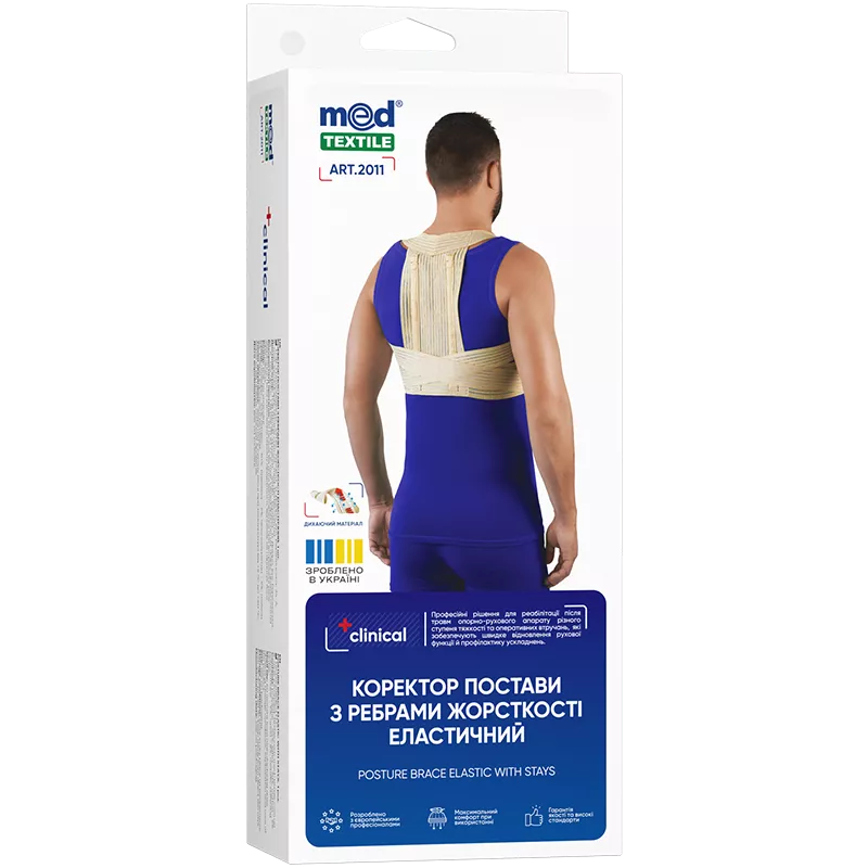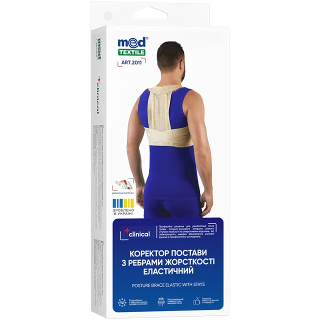 Коректор постави еластичний з двома ребрами жорсткості корегує неправильну поставу, зменшує болі у верхньому відділі спини, викликані кіфозом, сколіозом, остеопорозом або артритом, запобігає деформаціям хребта. Застосовується в період реабілітації після операцій і травм грудного відділу хребта. За рахунок ребер жорсткості коректор утворює додаткові точки опори хребта, що дозволяє збільшити силу впливу та отримувати кращі результати утримання спини в терапевтичному положенні.