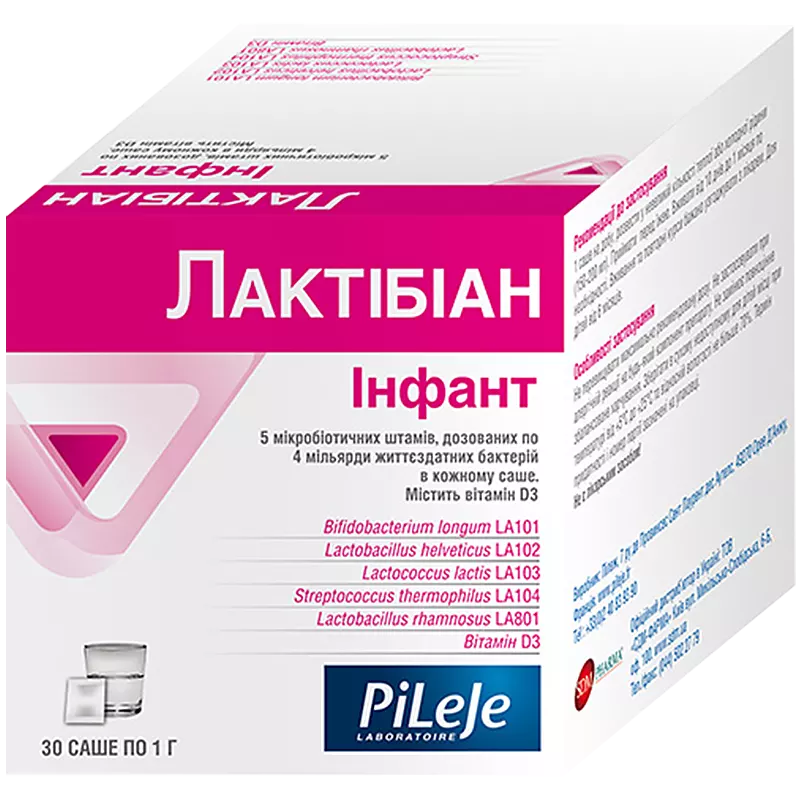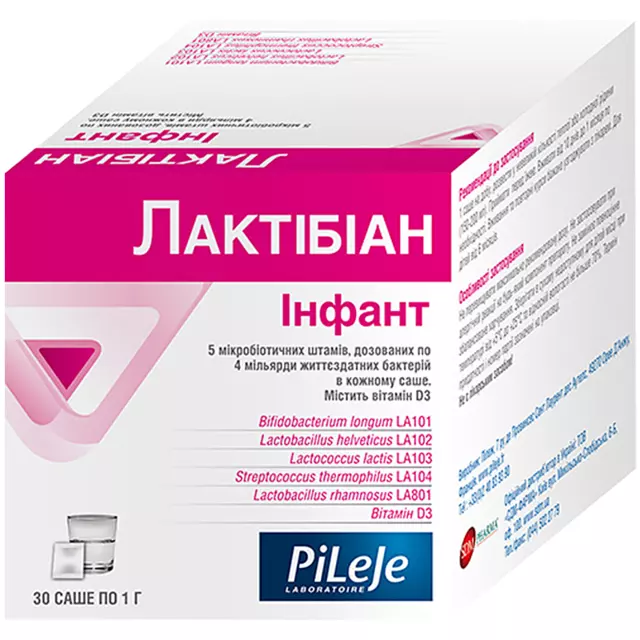 Лактібіан Інфант саші містить 5 спеціальних мікробіотичних штамів 4*109 КОЕ і вітамін D3 – 3,75 mg (150 МЕ):