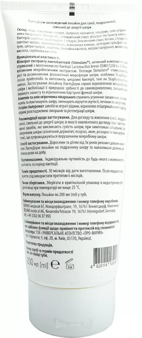 ЛактоДерм увлажняющий лосьон для сухой, раздраженной, склонной к аллергии кожи туба 200 мл, BELANO medical (Германия)