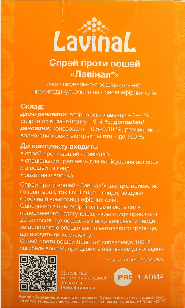 Ефірна олія лаванди є потужним природним репелентом (відлякує вошей) та забезпечує захист від повторного зараження, що дозволяє рекомендувати спрей «Лавінал® » також з метою ефективної профілактики головного педикульозу.
