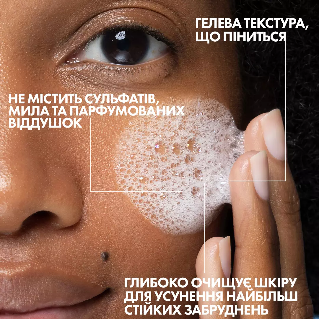 глибоко очищує шкіру для усунення найбільш стійких забруднень: надлишок себуму, макіяж (включно макіяж для очей) та забруднень із навколишнього середовища;