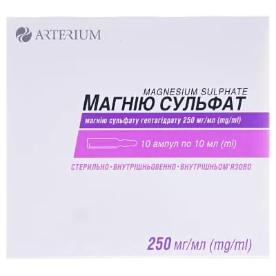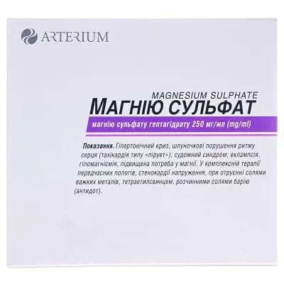Показання.Гіпертонічний криз, шлуночкові порушення ритму серця (тахікардія типу «пірует»); судомний синдром; еклампсія, гіпомагніємія, підвищена потреба у магнії. У комплексній терапії передчасних пологів, стенокардії напруження, при отруєнні солями важких металів, тетраетилсвинцем, розчинними солями барію (антидот).