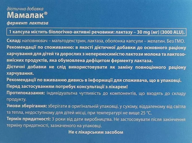 Мамалак® - джерело ферменту лактази, який необхідний для розщеплення та якісного засвоєння молочного цукру лактози. В дитячому віці фермент лактаза сприяє якісному засвоєнню молока та молочних продуктів.