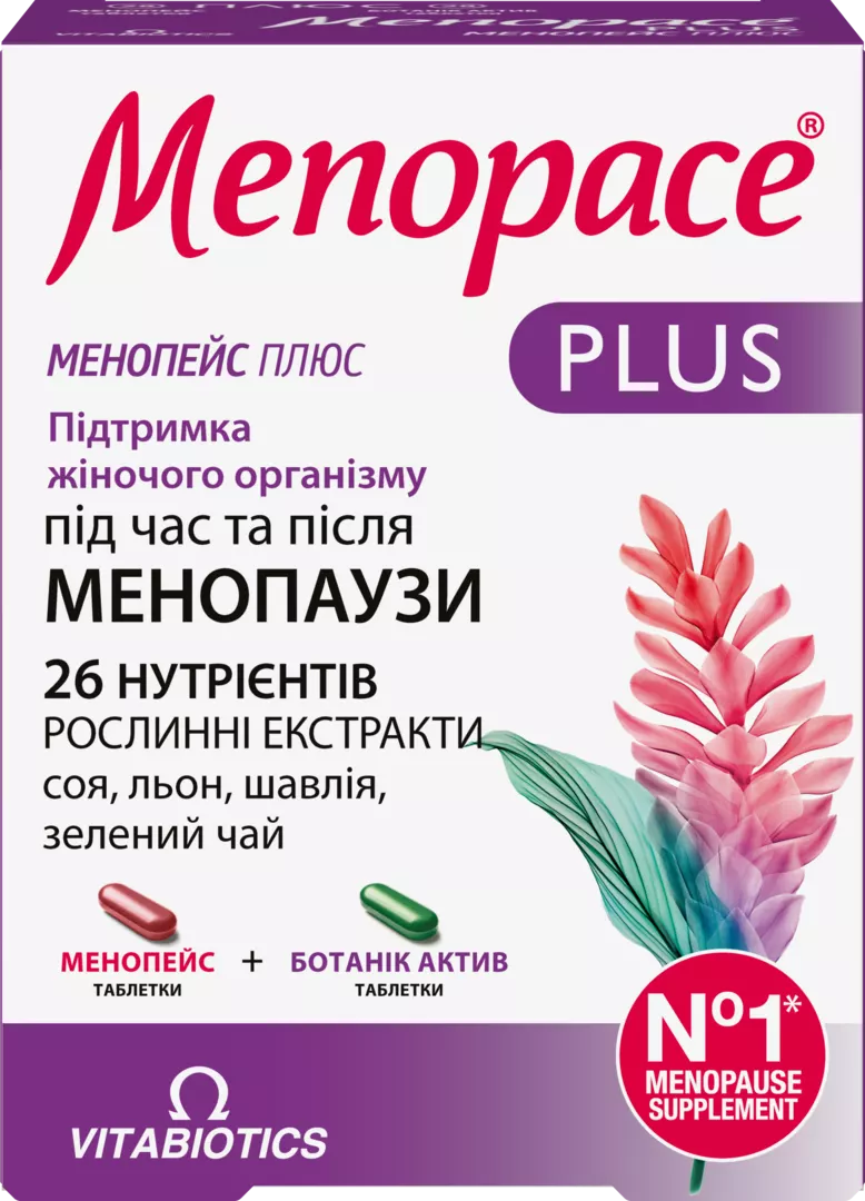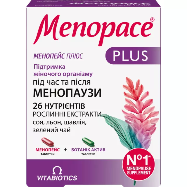 Застереження до застосування: індивідуальна підвищена чутливість до окремих компонентів. Не слід перевищувати рекомендовану добову дозу. Не слід використовувати як заміну повноцінного раціону харчування. Різноманітне і збалансоване харчування та здоровий спосіб життя важливі для вас. Склад таблетки Менопейс: загущувач мальтодекстрин, оксид магнію (магній), наповнювач целюлоза мікрокристалічна, аскорбінова кислота (вітамін С), сульфат цинку моногідрат (цинк), D-альфа-сукцинат токоферилової кислоти (вітамін Е) (з сої), кальцію D-пантотенат (пантотенова кислота), покриття таблетки Нутрафініш Грін 160U210010: полідекстроза, гідроксипропілметилцелюлоза, карбонат кальцію, тригліцериди середнього ланцюга, мідний хлорофілін; пара-амінобензойна кислота, нікотинамід (вітамін В3), екстракт соєвих ізофлавонів (з сої), фумарат заліза (залізо), тіамін мононітрат (вітамін В1), піридоксину гідрохлорид (вітамін В6), антиспікаючі агенти діоксид кремнію, стеаринова кислота; загущувач натрію кроскармелоза, ціанокобаламін (вітамін В12), покриття таблетки гідроксипропілметилцелюлоза, ретинолу ацетат (вітамін А), рибофлавін (вітамін В2), антиспікаючий агент магнію стеарат, покриття таблетки гліцерин рослинний, вітамін D3, сульфат міді безводний (мідь), марганцю сульфат моногідрат (марганець), наповнювач кальцію фосфат двоосновний, хлорид хрому 10% (хром), фолієва кислота (фолацин), йодид калію (йод), селеніт натрію безводний (селен), D-біотин (біотин). Без ГМО.Склад таблеток Ботанік Актив: загущувач мальтодекстрин, наповнювач целюлоза мікрокристалічна, екстракт соєвих ізофлавонів (з сої), целюлоза кремнієва мікрокристалічна, екстракт шавлії, екстракт зеленого чаю, лінумлайф 20% (стандартизований екстракт лігнану), покриття таблетки Нутрафініш Ред 168U250009: полідекстроза, гідроксипропілметилцелюлоза, карбонат кальцію, тальк, тригліцериди середнього ланцюга, оксид заліза червоний, оксид заліза чорний, оксид заліза жовтий; антиспікаючий агент діоксид кремнію, загущувач натрію кроскармелоза, антиспікаючі агенти стеаринова кислота, магнію стеарат. Без ГМО.