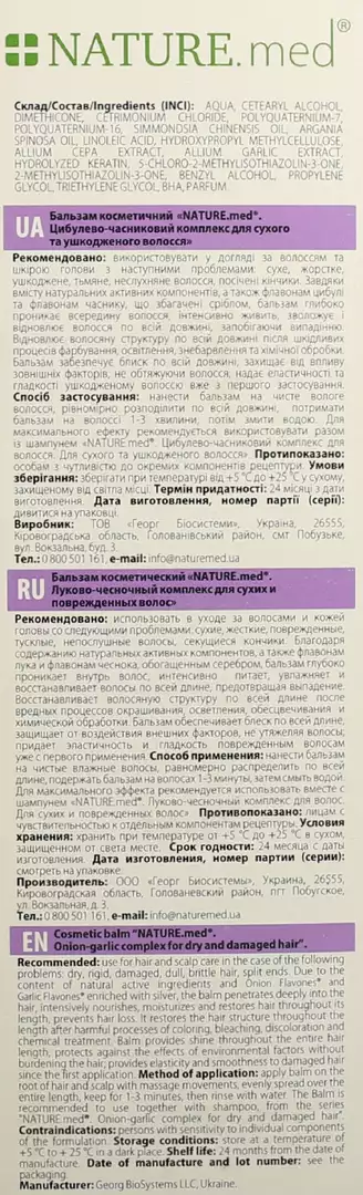 Для максимального ефекту рекомендується використовувати разом з шампунем «NATURE.med. Цибульно-часниковий комплекс для волосся. Для сухого і пошкодженого волосся ».