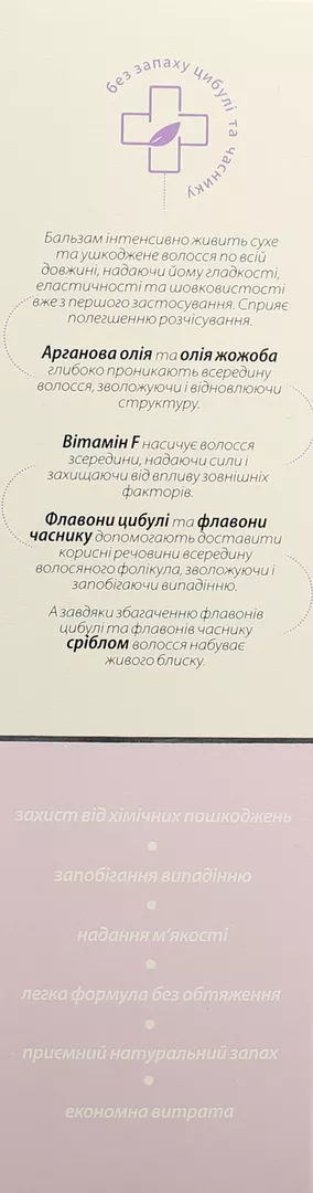 масло жожоба, вітамін F, арганова олія, флавони часнику, екстракт цибулі.