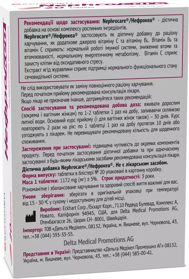 Спосіб застосування та рекомендована добова доза: вживати дорослим (зокрема і вагітним жінкам) по 1-2 таблетки 1 раз на добу, запиваючи склянкою питної води. Основний курс прийому (і для вагітних жінок також) – 30 днів. Курс повторюють 2 рази на рік: по 1 таблетці 1 раз на добу протягом 10 днів або узгоджують з лікарем. Не перевищувати рекомендовану кількість для щоденного споживання. Застереження при застосуванні: підвищена чутливість до окремих компонентів продукту. Перед початком застосування дієтичної добавки та при одночасному застосуванні з будь-якими лікарськими засобами рекомендована консультація лікаря.Дієтична добавка Nephrocare®/Нефрокеа®. Не є лікарським засобом.