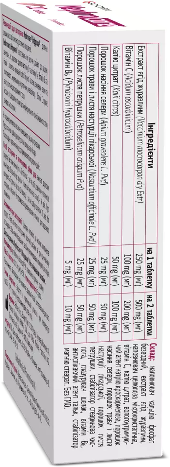наповнювач кальцію фосфат безводний, екстракт ягід журавлини, наповнювач целюлоза мікрокристалічна, вітамін C, калію цитрат, вологоутримуючий агент натрію кроскармелоза, порошок насіння селери, порошок трави і листя настурції лікарської, порошок листя петрушки, стабілізатор стеаринова кислота, глазурувач шелак, вітамін B6, антиспікаючий агент тальк, стабілізатор магнію стеарат. Без ГМО.