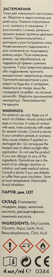 Етиллактат, гліцерин, вода, молочна кислота, ресацетофенон, лимонна кислота.