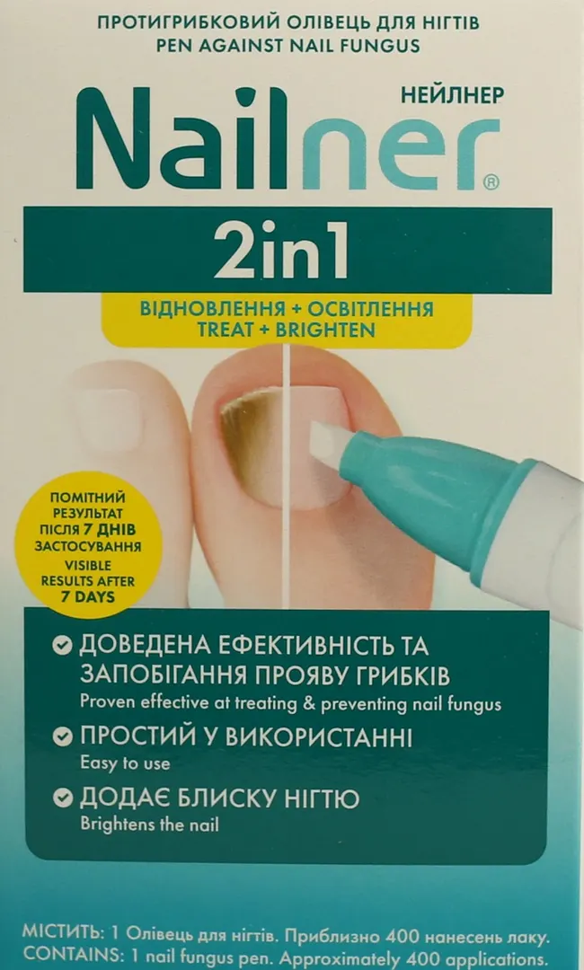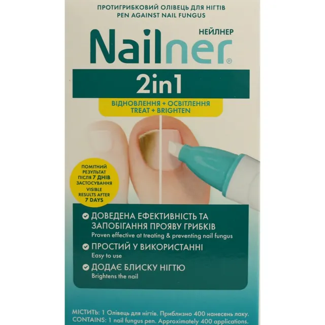 Олівець для нігтів протигрибковий Nailner 2in1 (Нейлнер 2 в 1) (4 мл) призначений для профілактики грибкової інфекції нігтів, одночасно швидше покращує зовнішній вигляд інфікованого нігтя, за рахунок додання блиску і додаткового ефекту освітлення.