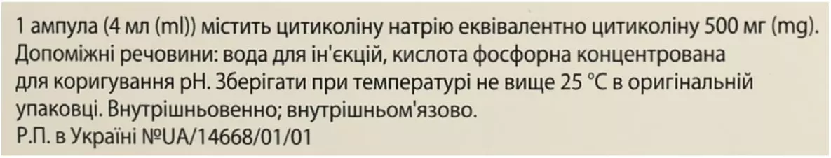 1 ампула (4 мл) містить цитиколіну натрію еквівалентно цитиколіну 500 мг або 1000 мг;