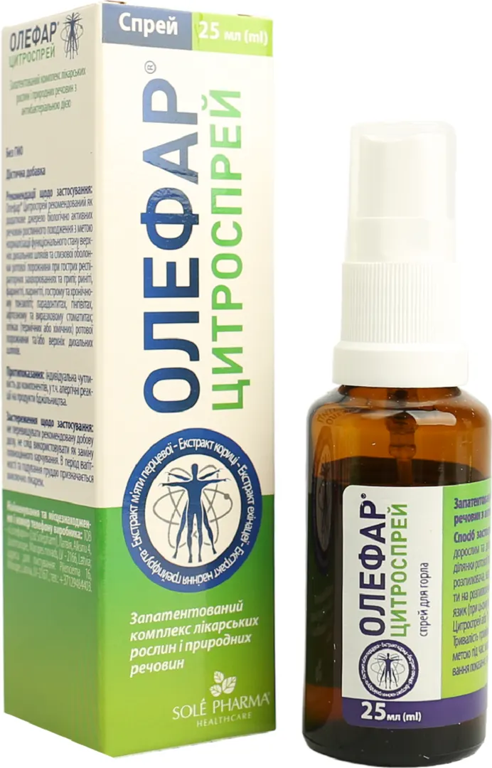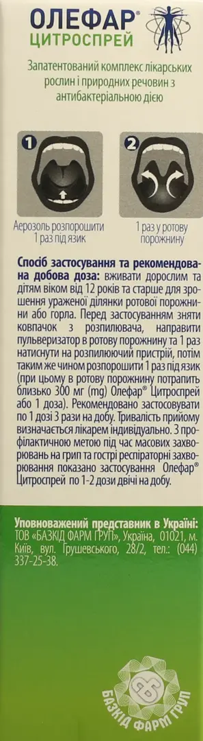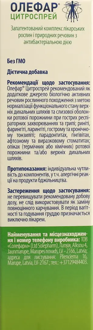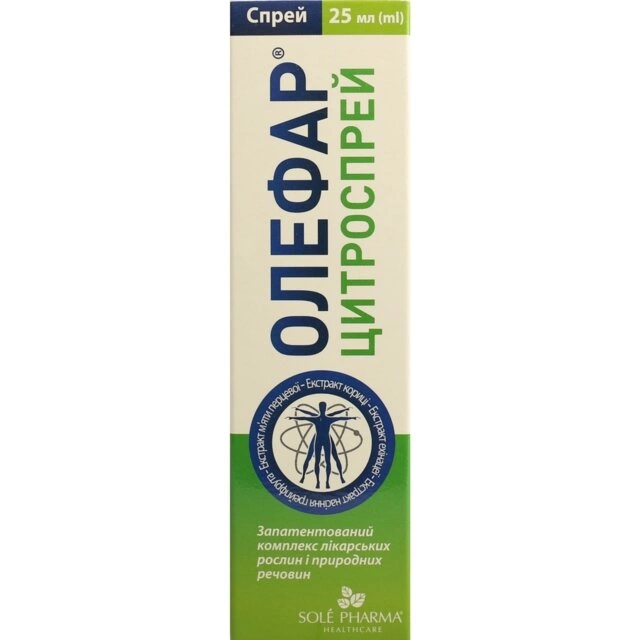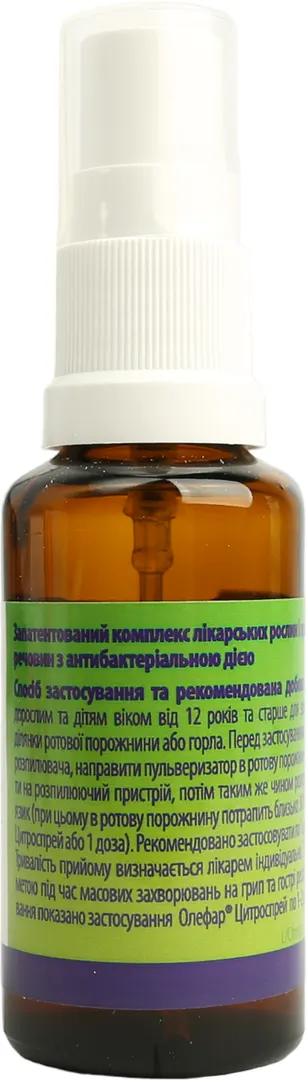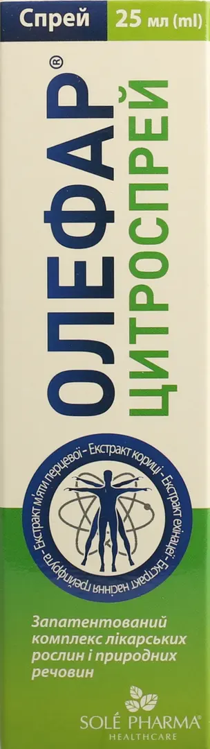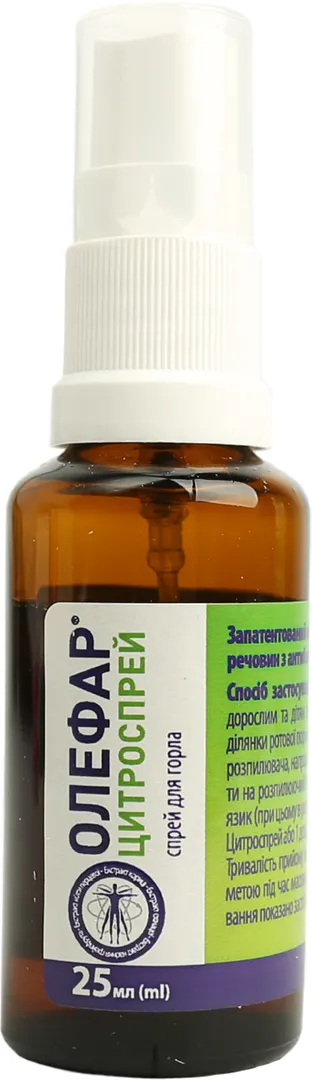 Функціональні властивості. Олефар® Цитроспрей – це інноваційний продукт, що містить запатентований комплекс лікарських рослин та природних речовин у вигляді розчину для орального застосування. Екстракт кориці (Cinnamomum verum) проявляє противірусні, антимікробні, протигрибкові (в т. ч. до Candida albicans), антитоксичні, протизапальні, спазмолітичні та заспокійливі властивості; нормалізує кровообіг та обмін речовин. Екстракт ехінацеї пурпурової (Echinacea purpurea) містить велику кількість природних біологічно активних речовин, завдяки чому проявляє виражені антибактеріальні та противірусні властивості (пригнічує ріст і розмноження стрептококу, стафілококу, кишкової палички, вірусів грипу та простого герпесу), чинить протизапальний та антиоксидантний ефекти. Екстракт насіння грейпфрута (Citrus paradisi) також містить велику кількість різних біофлавоноїдів та поліфенолів, що проявляють антибактеріальні, противірусні та антиоксидантні властивості, а також покращує засвоєння вітаміну С. Екстракт м’яти перцевої (Mentha piperita) містить ментол, флавоноїди, вітаміни, мікроелементи та має виражені антибактеріальні властивості проти багатьох типів бактерій, в тому числі метицилін-резистентного золотистого стафілокока, кишкової палички і сальмонели, чинить протинабрякову дію та покращує дренаж носової порожнини. Бета-циклодекстрин прискорює транспорт рослинних екстрактів і природних компонентів до кровоносного русла, що значно збільшує біодоступність діючих речовин продукту. Прополіс має потужні противірусні та протимікробні властивості, до яких не розвивається звикання. Флавоноїди у складі прополісу блокують ензими, що беруть участь у продукції простагландинів, проявляючи таким чином протизапальні властивості. Прополіс сприяє регенерації та епітелізації, забезпечуючи швидке відновлення тканин, стимулює синтез інтерферонів та активність імунокомпетентних клітин. Рекомендації щодо застосування: Олефар® Цитроспрей рекомендований як додаткове джерело біологічно активних речовин рослинного походження з метою нормалізації функціонального стану верхніх дихальних шляхів та слизової оболонки ротової порожнини при гострих респіраторних захворюваннях та грипі; риніті, фарингіті, ларингіті, гострому та хронічному тонзиліті; парадонтитах, гінгівітах, афтозному та виразковому стоматитах; опіках (термічних або хімічних) ротової порожнини та/або верхніх дихальних шляхів. Спосіб застосування та рекомендована добова доза: вживати дорослим та дітям віком від 12 років та старше для зрошення ураженої ділянки ротової порожнини або горла. Перед застосуванням зняти ковпачок з розпилювача, направити пульверизатор в ротову порожнину та 1 раз натиснути на розпилюючий пристрій, потім таким же чином розпорошити 1 раз під язик (при цьому в ротову порожнину потрапить близько 300 мг (mg) Олефар® Цитроспрей або 1 доза). Рекомендовано застосовувати по 1 дозі 3 рази на добу. Тривалість прийому визначається лікарем індивідуально. З профілактичною метою під час масових захворювань на грип та гострі респіраторні захворювання показано застосування Олефар® Цитроспрей по 1-2 дози двічі на добу. Протипоказання: індивідуальна чутливість до компонентів, у т.ч. алергічні реакції на продукти бджільництва. Застереження щодо застосування: не перевищувати рекомендовану добов