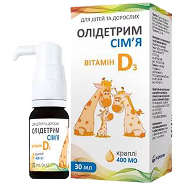 Дієтична добавка масляні краплі «Олідетрим Сім’я» у флаконі об’ємом 30 мл містить 199 доз продукту.