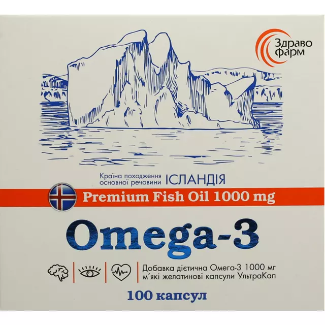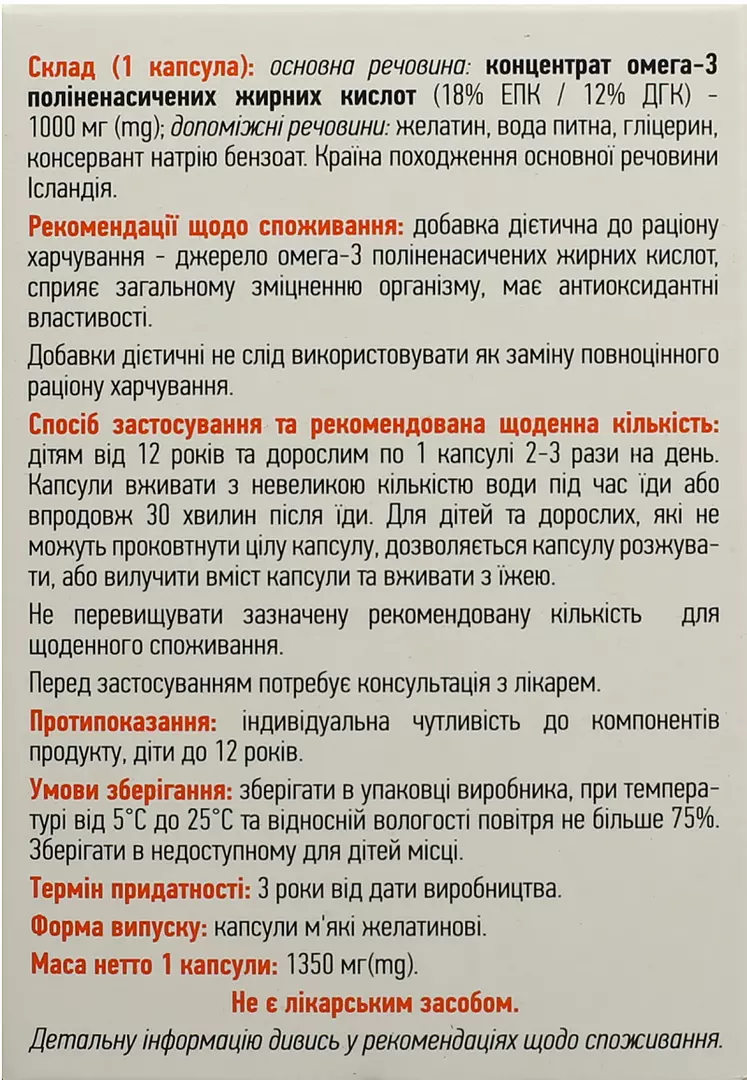 Основна речовина: концентрат омега-3 поліненасичених жирних кислот (18% ЕПК / 12% ДГК) - 1000 мг;
