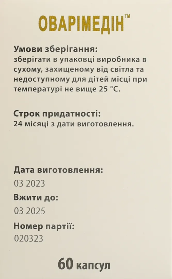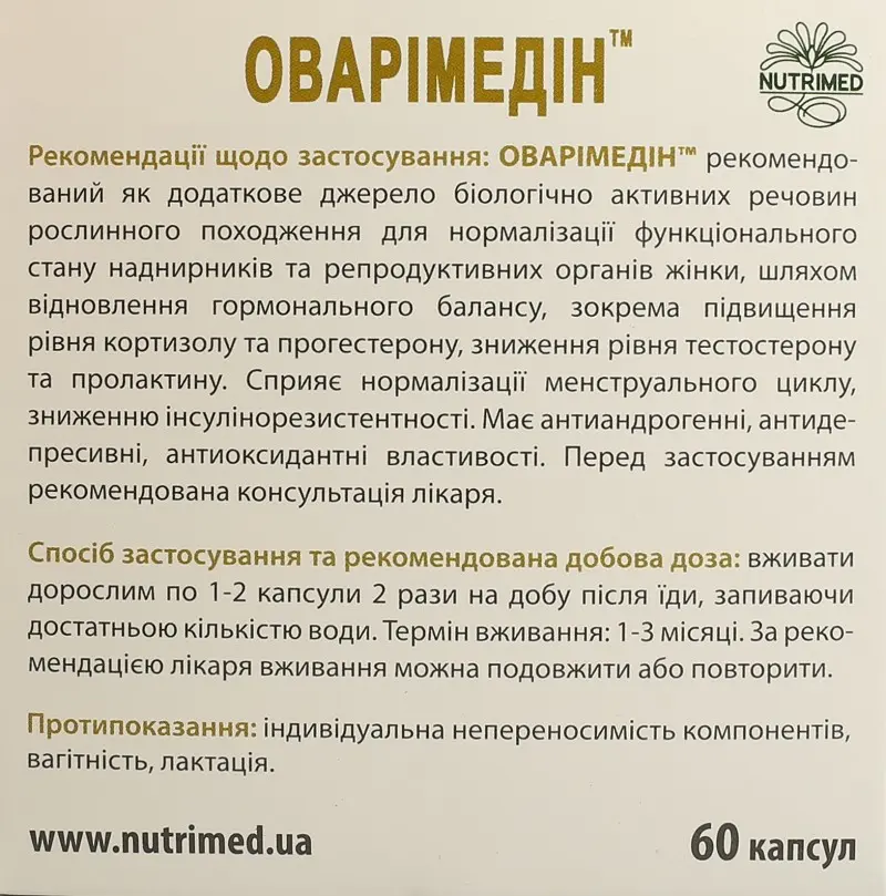 РЕКОМЕНДАЦІЇ ЩОДО ЗАСТОСУВАННЯ: ОВАРІМЕДІН™ реко­мендований як додаткове джерело біологічно активних речовин рослинного походження для нормалізації функціонального стану наднирників та репродуктивних органів жінки, шляхом відновлення гормонального балансу, зокрема підвищення рівня кортизолу та прогестерону, зниження рівня тестостерону та про­лактину. Сприяє нормалізації менструального циклу, зниженню інсулінорезистентності. Має антиандрогенні, антидепресивні, антиоксидантні властивості.
