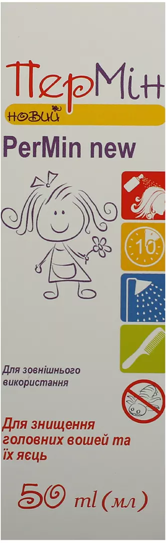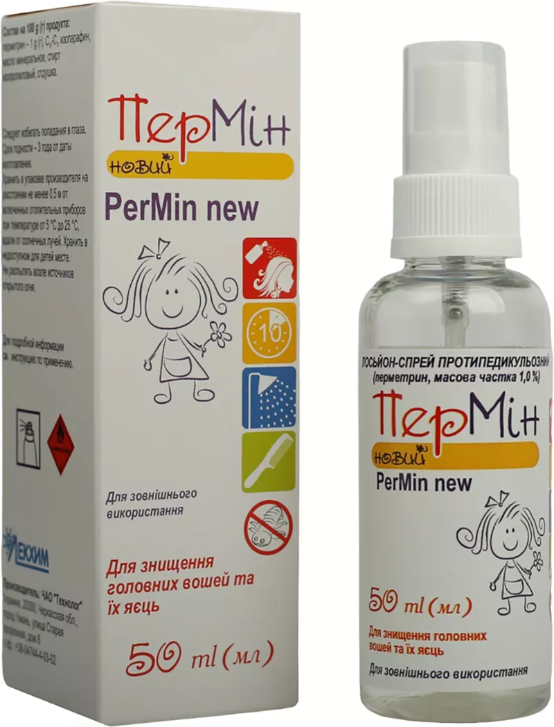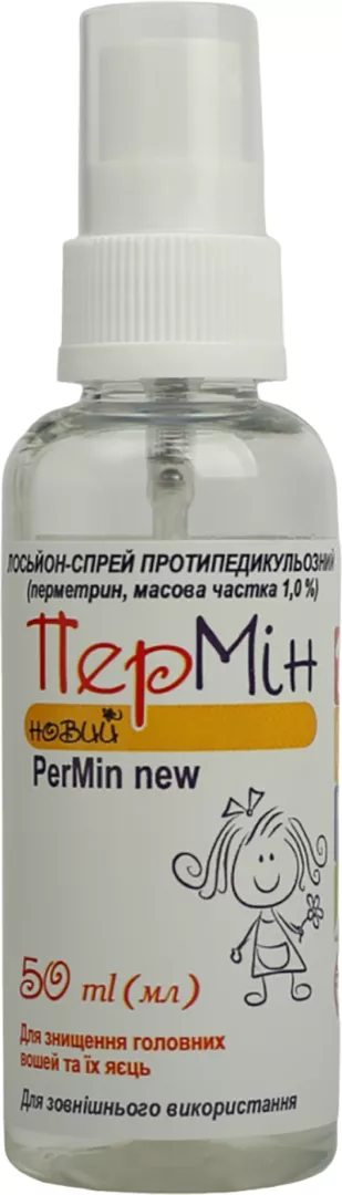 Лосьйон-спрей протипедикульозний «Пермін новий» призначений для знищення головних вошей (імаго, личинки, яйця) населенням в побутових умовах.