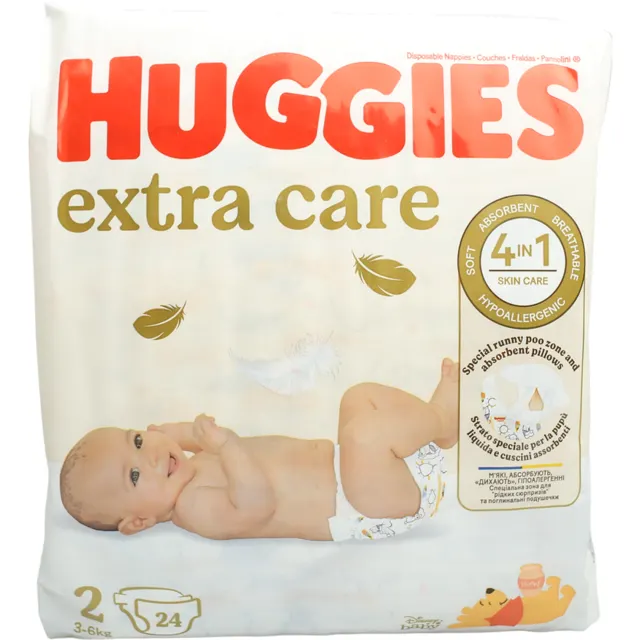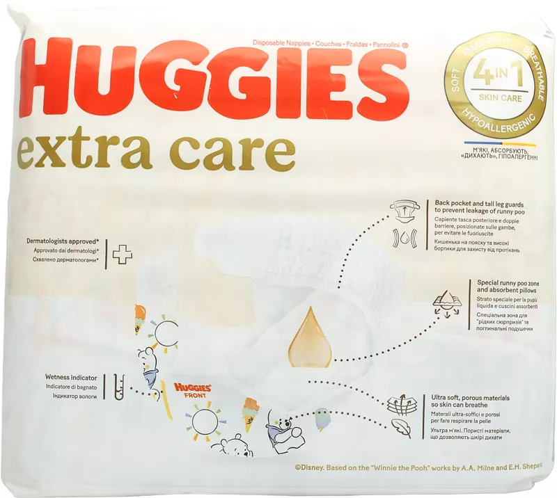Підгузки Huggies Extra Care турбуються про ніжну шкіру малюка в ці важливі перші місяці життя, вони підходять як для хлопчика, так і для дівчинки. В кожному упакуванні ви знайдете унікальні яскраві дизайни від Disney з героями мультфільмів про Вінні Пуха.