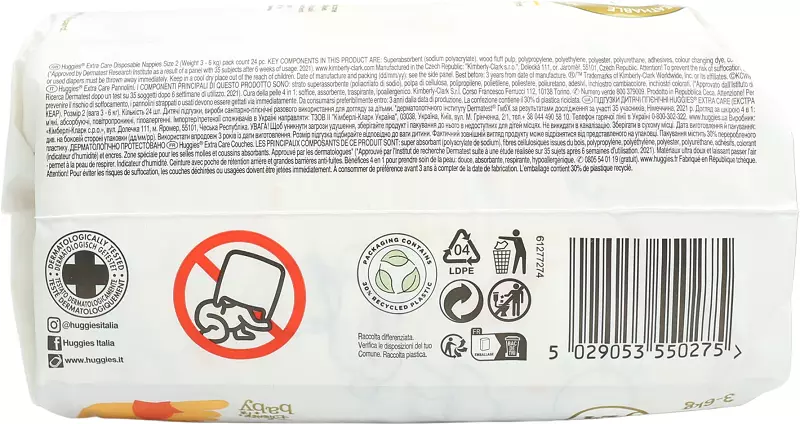 Нові покращені підгузки Huggies Extra Care – це наступне покоління вже добре відомих та улюблених преміальних підгузків Huggies Elite Soft. Вони створені з урахуванням особливостей ніжної шкіри новонароджених, яка в 3 рази тонша і чутливіша за дорослу шкіру. Підгузки Huggies Extra Care схвалені дерматологами і підходять для шкіри, схильної до подразнень.