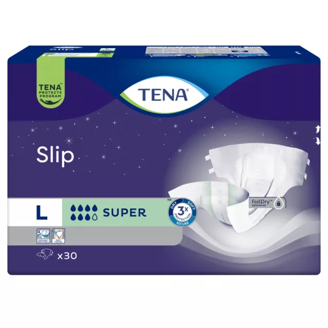 Подгузники TENA Slip Super c технологией FeelDry Advanced ™ - это универсальные средства защиты при недержании, которые обеспечивают тройную защиту для сухости, мягкости и предотвращения протеканий. Благодаря технологии FeelDry Advanced ™ с новыми верхним и распределительным слоями жидкость мгновенно отводится от кожи и впитывается подгузником, а высокоабсорбирующая сердцевина с суперабсорбеном (SAP) удерживает даже большие ее объемы, обеспечивая сухость и комфорт, что так важно для здоровья кожи. Подгузники отличаются хорошо прилегающей к телу посадкой и высокой степенью защиты от протеканий. Они изготовлены из мягкого дышащего материала с использованием технологии ConfioAir™, который обеспечивает циркуляцию воздуха и позволяет коже дышать. Двойные эластичные барьеры у ног служат дополнительной защитой от протеканий. Открытый дизайн с эластичным поясом и прочными застежками обеспечивает быструю смену в положении стоя или лежа, позволяют многократно перестегнуть и отрегулировать подгузник для надежной и комфортной посадки. Для предупреждения появления нежелательного запаха в изделии используется система нейтрализации запаха Odour Neutralizer, а индикатор влаги подсказывает, когда необходимо сменить подгузник.