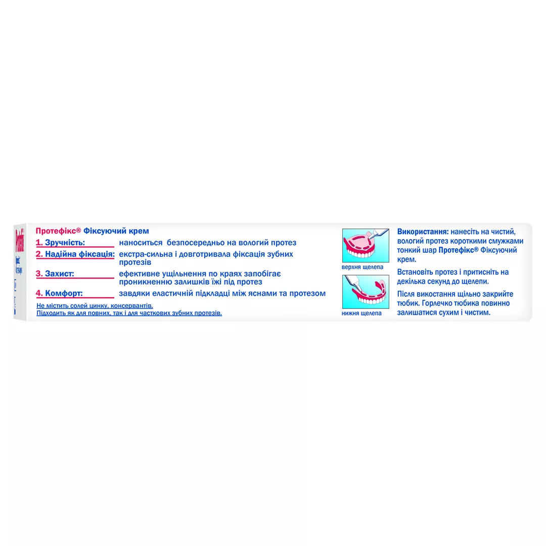 Перед використанням розім’яти тюбик. Протези та порожнину рота очистити від залишків їжі. На вологі протези нанести тонкою смужкою Protefix ® (Протефікс®) Фіксуючий крем екстра-сильний (в заглиблення на зубних протезах верхньої та/або нижньої щелепи, які потім лягають на ясна). При необхідності можна нанести тонку смужку фіксуючого крему і на задню частину пластини протезу верхньої щелепи. Потім вставити протез і на декілька секунд притиснути до ясен. Сильна фіксація виникає практично відразу та триває протягом 8-12 годин.