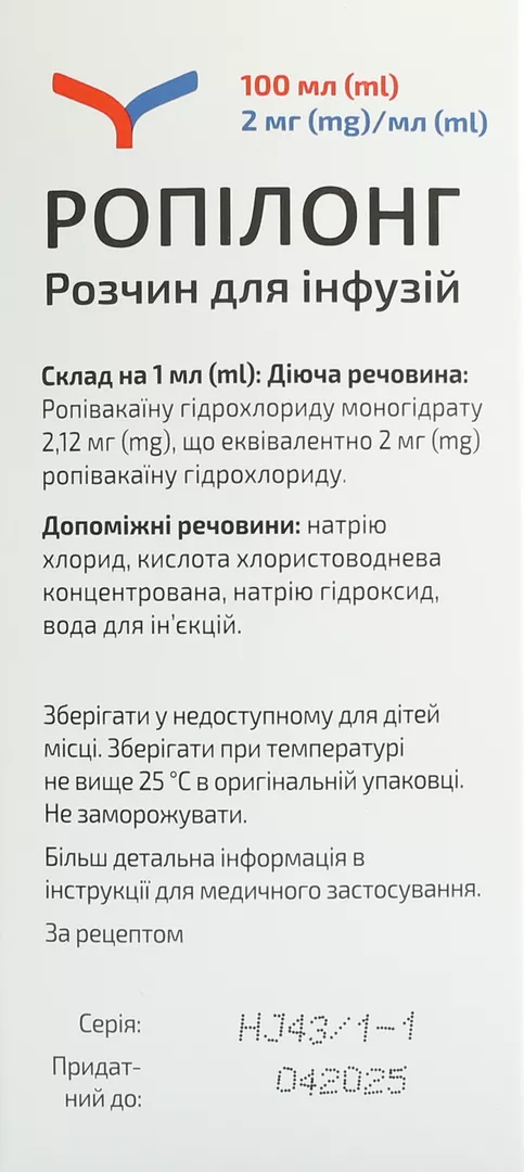 1 мл розчину містить ропівакаїну гідрохлориду моногідрату 2,12 мг, що еквівалентно 2 мг ропівакаїну гідрохлориду;