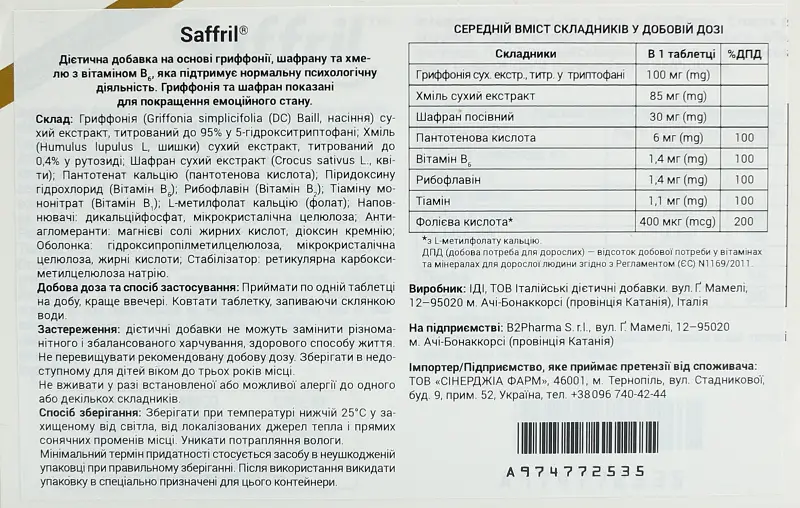 Рекомендації щодо застосування. Saffril® – це дієтична добавка на основі гриффонії, шафрану та хмелю з вітамінами групи В. Гриффонія та шафран сприяють нормалізації емоційного стану, їхню дію підсилює вітамін В6, який позитивно впливає на нормалізацію психологічної функції. Крім того, гриффонія разом з хмелем покращують сон, який може порушуватися у випадку стресу. Спосіб застосування. Приймати по одній таблетці на добу, краще ввечері. Ковтати таблетку, запиваючи склянкою води. Застереження. Дієтичні добавки не слід сприймати як замінники різноманітного збалансованого харчування та здорового способу життя. Не перевищувати рекомендовану добову дозу. Зберігати в недоступному для дітей віком до трьох років місці. Не приймати у разі встановленої або можливої алергії до одного або декількох складників. Умови зберігання. Зберігати при температурі нижчій 30о С; уникати впливу джерел тепла, потрапляння сонячних променів та вологи. Мінімальний термін придатності стосується засобу в неушкодженій упаковці при правильному зберіганні.Після використання не викидати упаковку в спеціально не призначені для цього контейнери.
