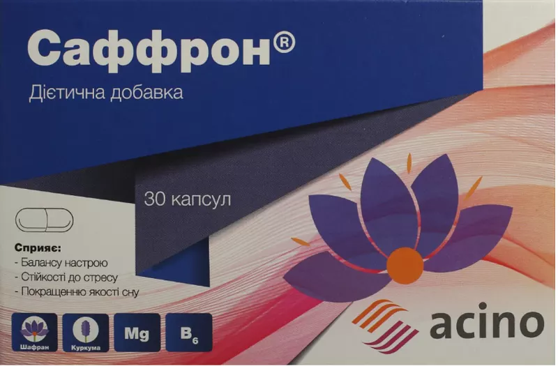 Склад. 1 капсула (добова доза) містить: екстракт шафрану - 28 мг, екстракт кореня куркуми, стандартизований до 95% куркуміну - 50 мг, магній у формі карбонату магнію - 50 мг, вітамін В6 - 5,4 мг. Опис. Дієтична добавка, що сприяє балансу настрою, стійкості до стресу, поліпшення якості сну. Рекомендації щодо застосування. Саффрон може бути рекомендований як дієтична добавка до раціону харчування як додаткове джерело магнію, вітаміну В6, біологічно активних речовин шафрану і куркуми. Ефективне поєднання складових підтримує нормальний функціональний стан нервової і серцево-судинної систем, підсилює стійкість до психічної і стресової напруги, сприяє розумовій рівновазі і балансу настрою, сприяє нормалізації глибини і якості сну. Спосіб застосування. По 1 капсулі на добу з невеликою кількістю рідини. Споживати незалежно від прийому їжі. Тривалість споживання визначається індивідуально.Не вживати після закінчення терміну придатності, зазначеного на упаковці.