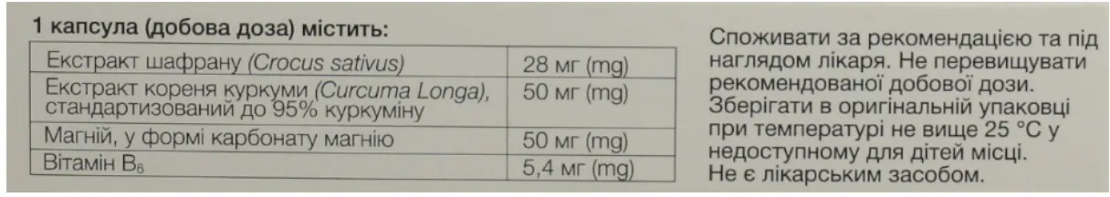 1 капсула (добова доза) містить: екстракт шафрану - 28 мг, екстракт кореня куркуми, стандартизований до 95% куркуміну - 50 мг, магній у формі карбонату магнію - 50 мг, вітамін В6 - 5,4 мг.